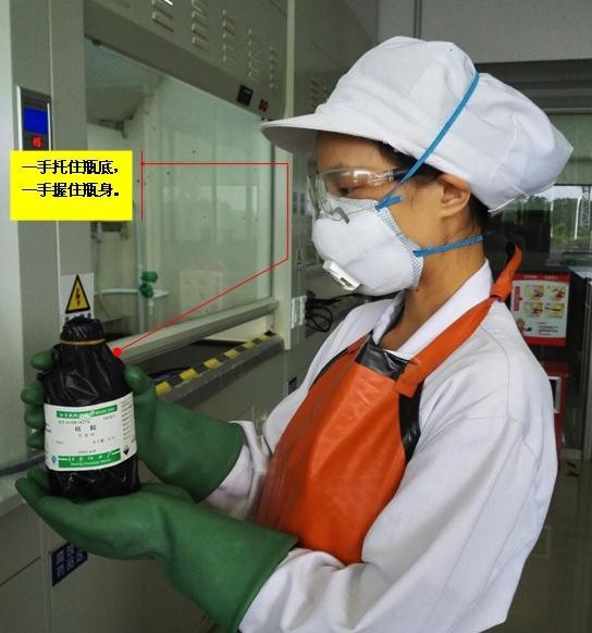 取放強(qiáng)酸、強(qiáng)堿等腐蝕性試劑時(shí),注意雙手拿取,一手托住瓶底,一手握住瓶身,切不可單手或提著瓶蓋操作。 操作強(qiáng)腐蝕性的藥品(如濃酸、濃堿類)需要配戴防腐手套、戴圍裙;對(duì)于可能因反應(yīng)劇烈產(chǎn)生揮發(fā)性氣體或噴濺物的需佩戴防爆護(hù)目鏡,并在通風(fēng)櫥內(nèi)操作,將通風(fēng)櫥玻璃幕拉下,擋住操作者面部;操作過程要注意避免藥品灑濺到皮膚及身物上,如果有灑濺需要立即清理。
