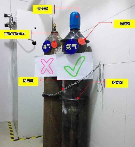 氣瓶放置時(shí)安全帽需旋緊,鋼瓶必須有兩個(gè)橡膠防震圈,氣瓶氣體與外部標(biāo)志需一致。待用氣瓶需要放置空瓶實(shí)瓶標(biāo)示以區(qū)分,避免誤用,防倒鏈可防止由于人為原因推動(dòng)氣瓶所造成的氣瓶傾倒。
